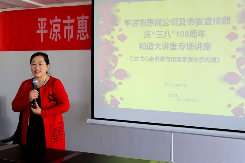 讲座由平凉市心理学会会长、国家执业医师、国家二级心理咨询师、EAP高级讲师张素珠老师主讲,张老师以“妇女心身健康与家庭及社会和谐”为主题,作了深入浅出,激情洋溢的讲座,讲座结合专业的学识和通俗的语言,系统讲解了女性自出生到婚育各个成长阶段的心理健康养护和相关心理问题矫正知识,深入分析了女性心理发展与家庭、社会的关系,结合现实案例解答了普通家庭生活中常见的心理和家庭关系问题。