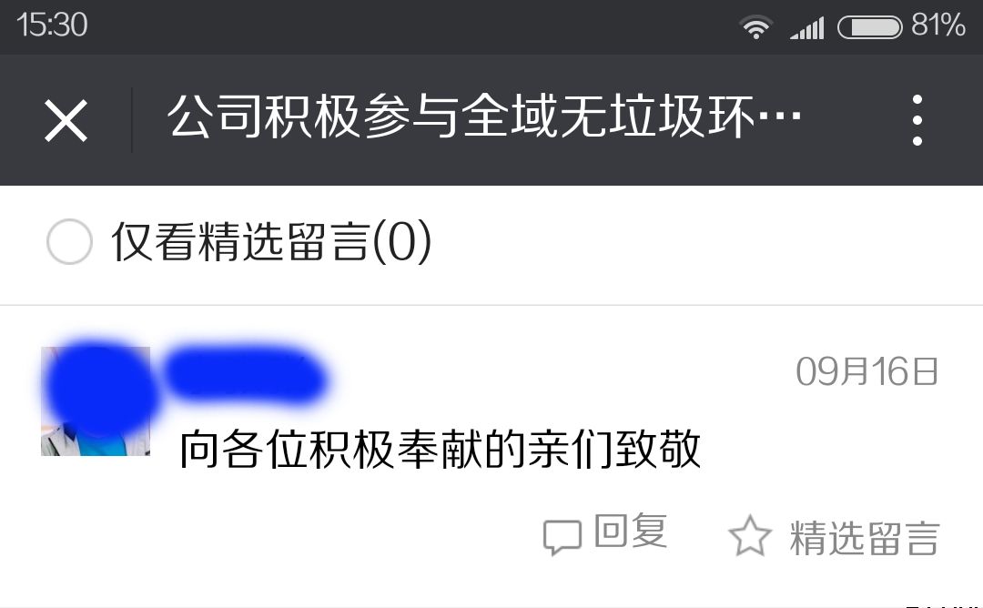 惠民公司全体员工无私贡献,为城市绿色整洁所付出的善行义举也被社会各界群众所称赞,纷纷点赞支持。有网友在笔者朋友圈留言:“惠民公司处处体现惠民平凉人民”,还有网友在惠民公司微信公众号留言:“向各位积极奉献的亲们致敬”。