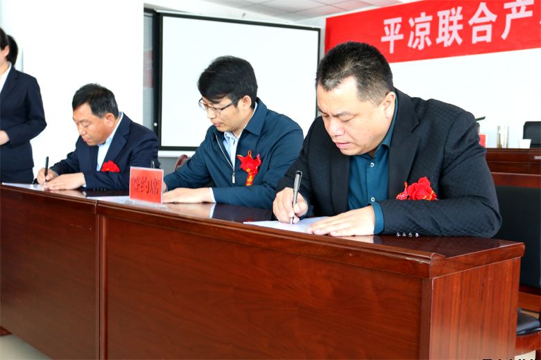 仪式现场,平凉市城乡建设投资有限责任公司党委副书记、总经理唐常宁,甘肃省产权交易所股份有限公司总经理赵永涛,平凉市城乡建设投资有限责任公司副总经理、平凉联合产权服务有限公司总经理柳振源共同签署《产权交易委托框架协议》。