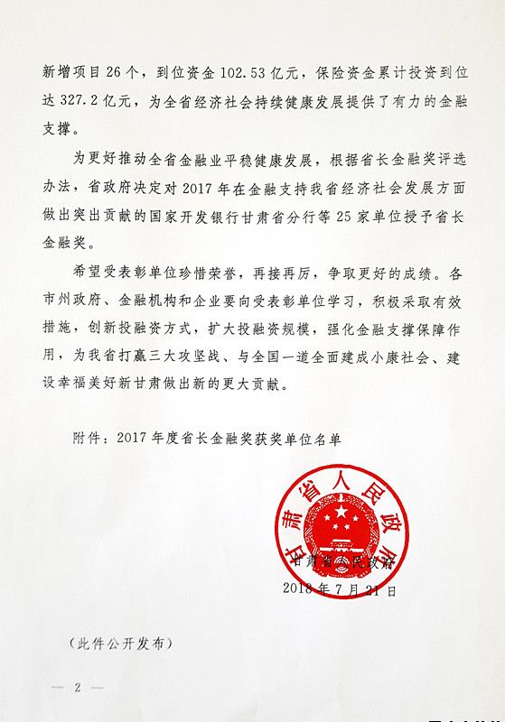 7月23日,省委、省政府召开全省金融工作会议,对2017年支持我省经济发展贡献突出的单位授予省长金融奖,平凉市城乡建设投资有限责任公司荣获该奖项,这是平凉市2017年度唯一一家获此殊荣的单位。