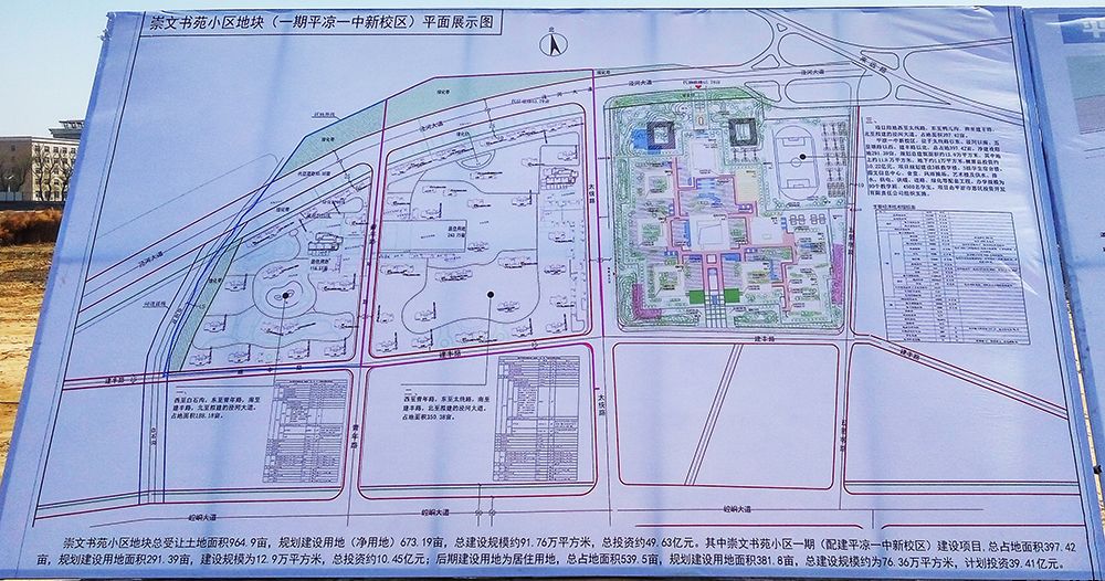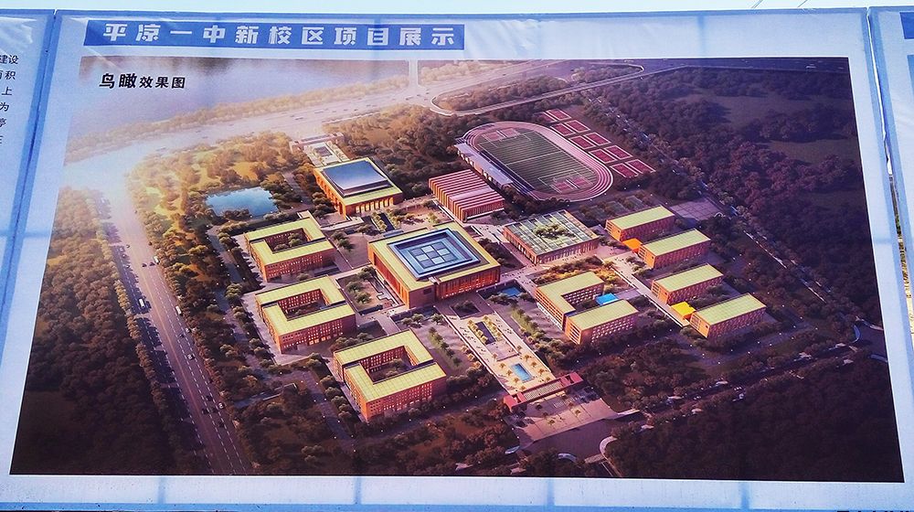 平凉一中新校区建设项目位于太统路以东、泾河以南、五里墩路以西、建丰路以北,总占地397.42亩,净建设用地291.39亩,规划总建筑面积约12.9万平方米,其中地上约10.9万平方米,地下约2万平方米,概算总投资约10.45亿元。项目规划建设3栋教学楼、3栋学生宿舍楼、图文信息中心、食堂、风雨操场、艺术楼及供水、排水、供电、供暖、道路、绿化等配套工程。办学规模为90个教学班、4500名学生。