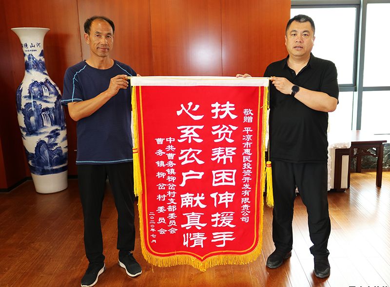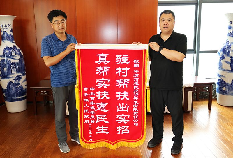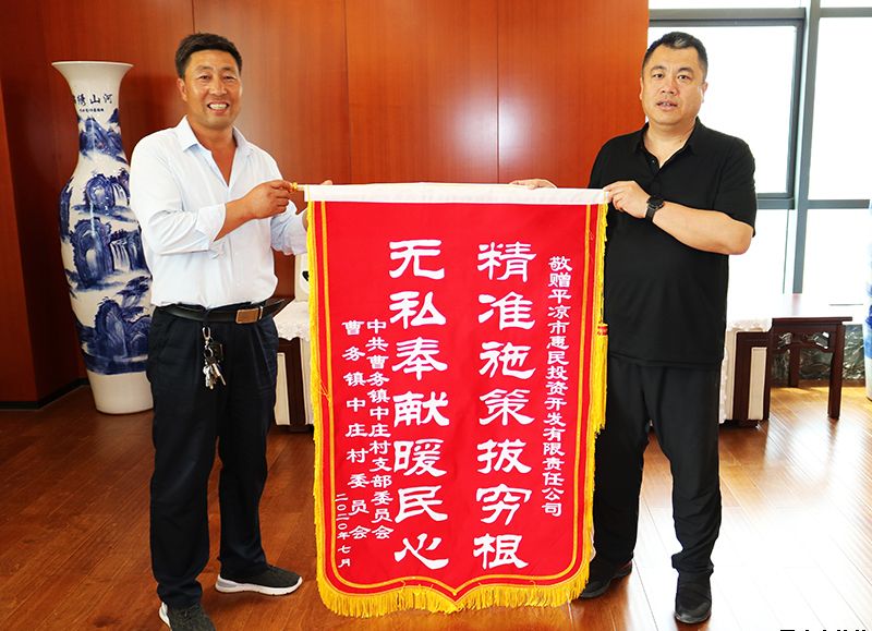 7月3日,静宁县曹务镇党委书记徐小胜、镇政府梁涛、曹务镇中庄村党支部书记兼村委会主任霍小军、曹务镇柳岔村党支部书记兼村主任柳和显等一行4人到市惠民公司,代表静宁县曹务镇党委、镇政府及中庄村、柳岔村,向市惠民公司敬赠锦旗,对惠民公司一直以来大力帮扶救助表示衷心感谢。市惠民公司党委书记、董事长唐常宁代表公司接受锦旗,党委委员、副总经理郑忠军参加仪式。