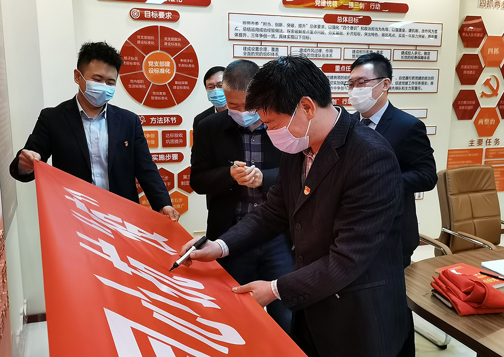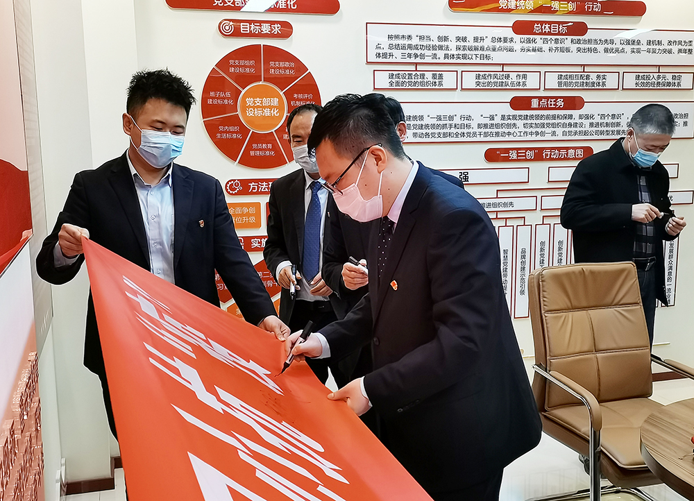 活动现场宣读了“共同抗疫、文明过节”倡议书,全体党员面对党旗郑重宣誓,坚决做好疫情防控工作,随后,参与活动人员纷纷在印有“赤心向党,同心抗‘疫’”的条幅上签名,争做企业疫情防控的先遣队与“逆行者”。