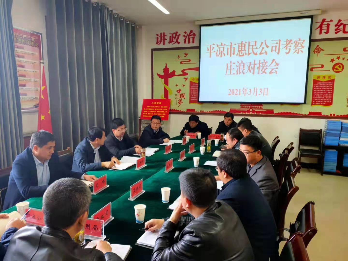 按照公司统一安排,3月3日平凉市城乡建设投资有限责任公司(市惠民公司)副总经理马新平,资产运营部、惠民房产公司、惠民停车场公司负责人一行4人赴庄浪县洽谈项目合作。庄浪县副县长樊对对主持座谈会,县发改局、住建局、自然资源局、卫健局、民政局、招商局、公用局、文旅公司、城投公司、农发公司负责人参加座谈。