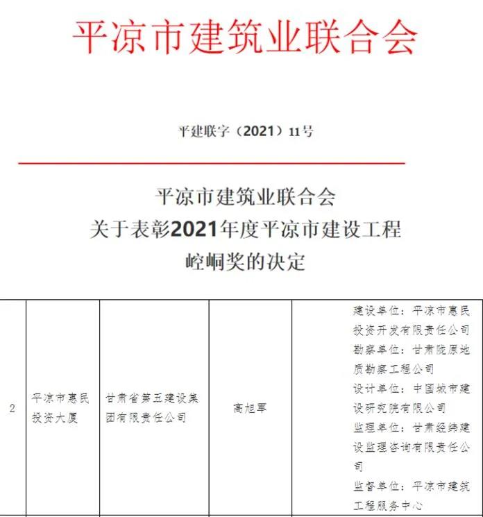 岁末年初,捷报频传,在公司上下欢庆惠民公司成立十周年之际,平凉市建筑企业联合会发布《关于表彰2021年度平凉市建设工程崆峒奖的决定》,由平凉市惠民投资开发有限责任公司开发建设,房产公司具体实施的惠民投资大厦项目荣获2021年度平凉市建设工程崆峒奖。
