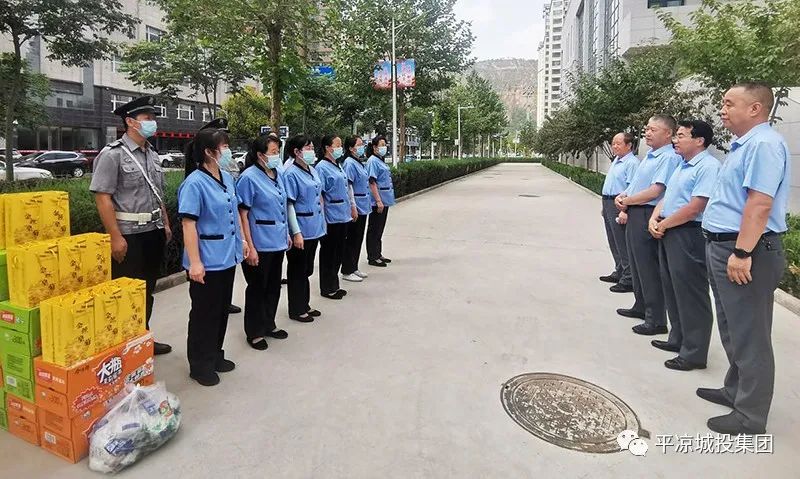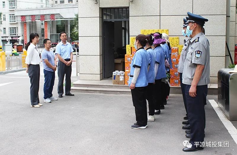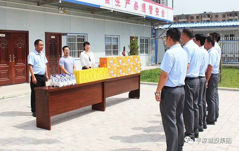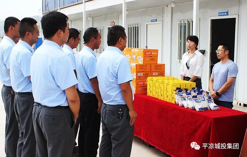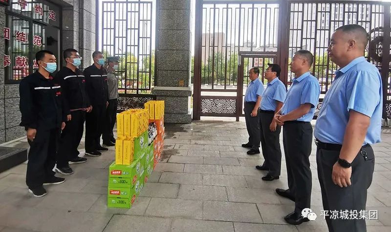 为做好高温酷暑期间的防暑降温工作,进一步传递集团公司对一线职工的关爱,7月26日,受公司党委委员、总经理胡红训委托,公司副总经理王徐周、郑忠军、马新平、王彦彦分组带领党委办(办公室)、工会工作人员,前往房产公司泾河流域治理、崇文书苑二期建设项目工地,物业公司所属市委、市政府、市中级法院、区法院、惠民大厦、御景华府物业服务中心,停车场公司封闭停车场,向奋战在一线的96名工作人员送去慰问,并将公司准备的慰问品送到他们手中。