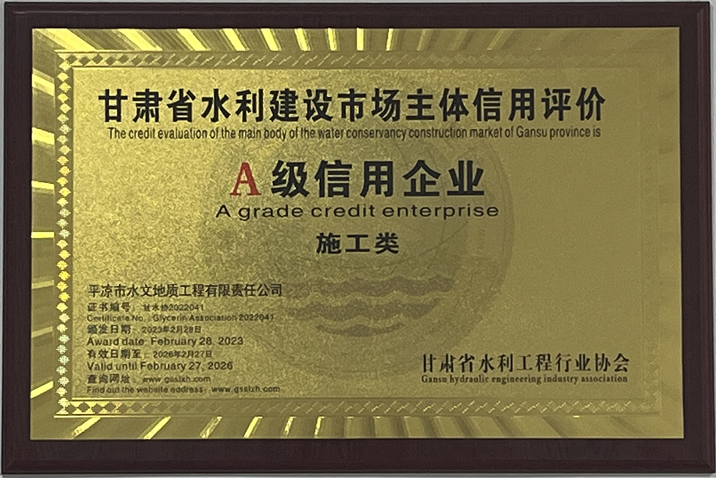 近日,甘肃省水利工程协会发布《关于2022年度甘肃省水利建设市场主体信用评价结果的公示》,水文地质工程公司荣获2022年度甘肃省水利建设市场主体信用评价A级信用企业!