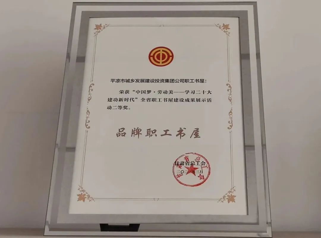 近日,由省总工会组织开展的“中国梦•劳动美——学习二十大 建功新时代”全省职工书屋建设成果展示活动、职工经典诵读征集展播活动评选结果揭晓,平凉市城乡发展建设投资集团有限公司职工书屋荣获“品牌职工书屋”。