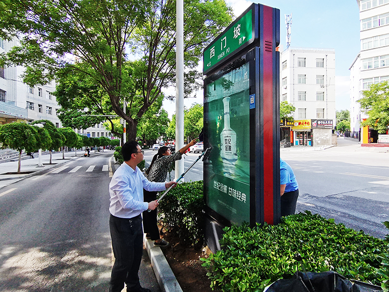 活动中,全体员工分组前往西门坡、文化街、石家巷、西大街等城区主干道,对道路指示牌进行了认真细致的清洗,铲除清洁了粘贴的小广告,对广告设施内部电子元件做了维护保养,确保箱体无积尘、无乱涂画、无乱张贴等现象,以实际行动为创建文明城市和公司发展贡献力量。