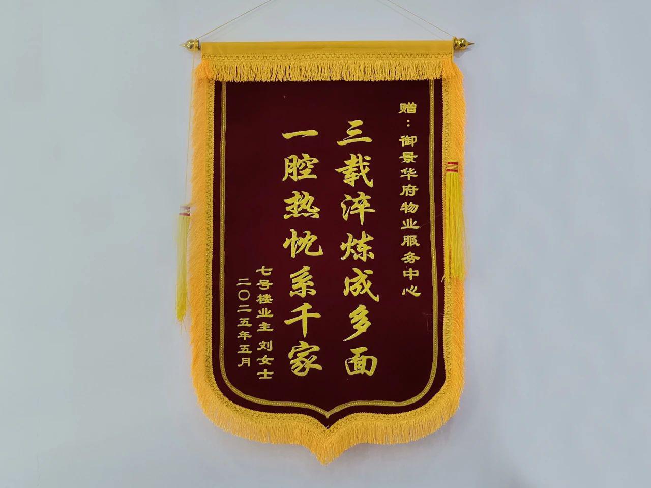 5月26日,御景华府小区业主刘女士向物业服务中心赠送了一面绣有“三载淬炼成多面,一腔热忱系千家”的锦旗,并附上一封感谢信。