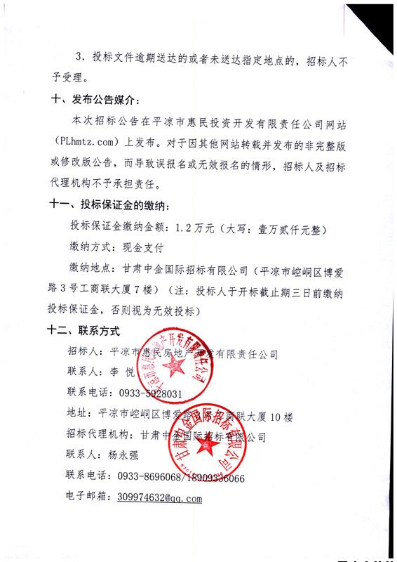 2.投标文件递交地点为:平凉市惠民房地产开发有限责任公司会议室(平凉市崆峒区博爱路3号工商联大厦11楼)。