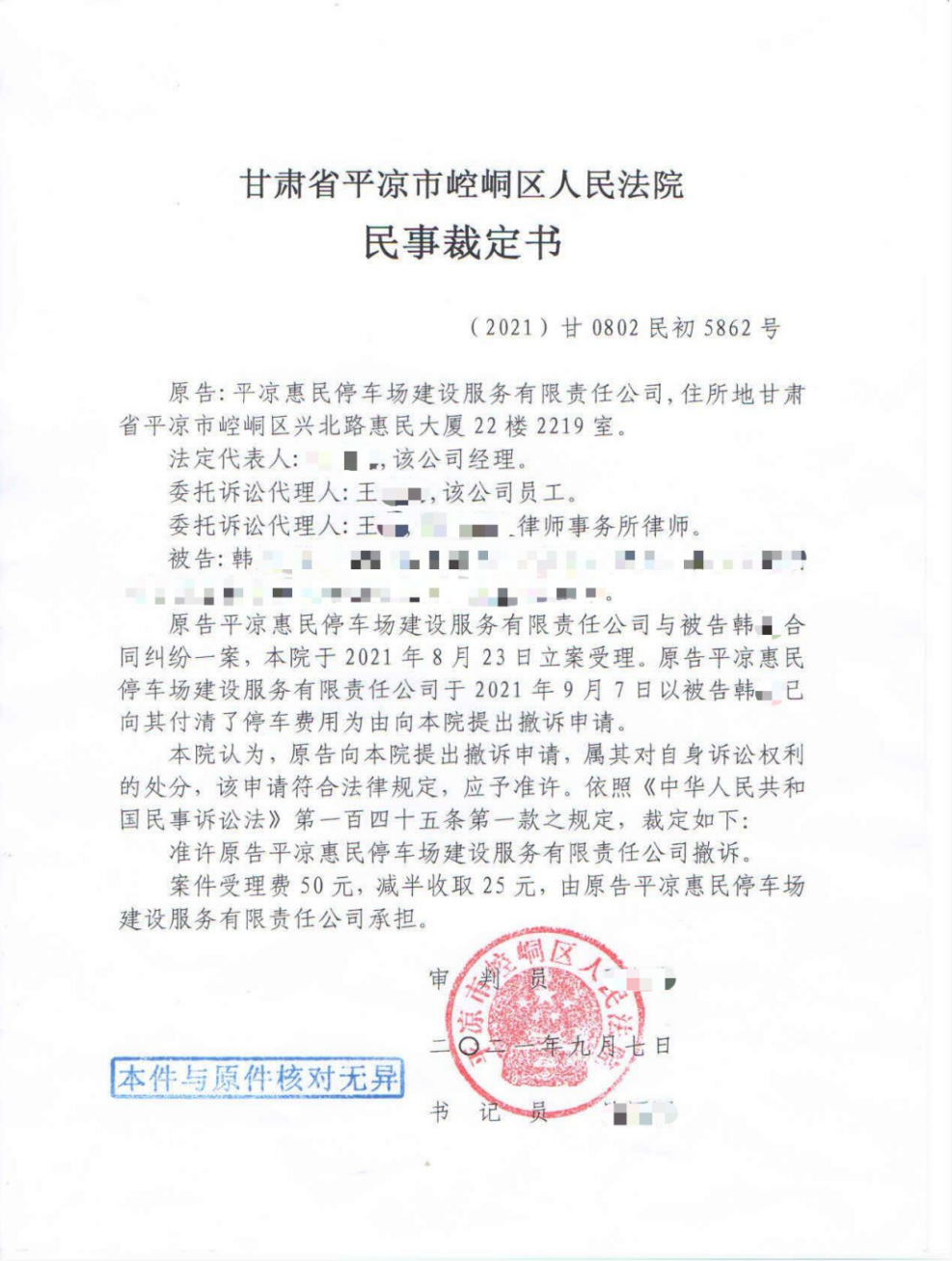 截止2021年9月底我公司向崆峒区人民法院递交了第一批道路停车欠费车辆的诉讼申请。经崆峒区人民法院速裁,所有涉诉车辆欠费已全部追回。
