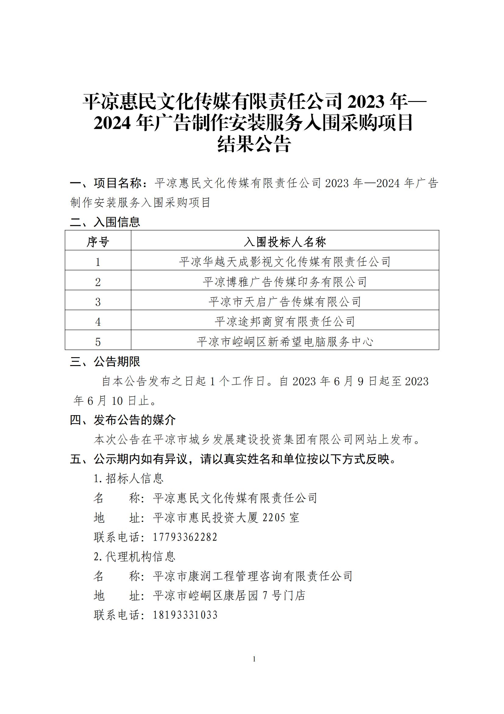 平凉惠民文化传媒有限责任公司2023年—2024年广告制作安装服务入围采购项目结果公告