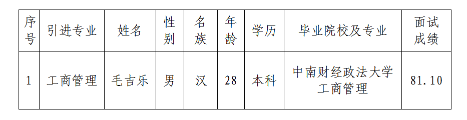 根据《平凉市2023年引进急需紧缺人才公告》《关于延长平凉市2023年引进急需紧缺人才报名时间的补充公告》《平凉市急需紧缺人才引进管理办法》(平发〔2021〕23号)要求,经组织报名、资格审查、面试、考察、体检等程序,确定毛吉乐同志为平凉市城投集团2023年急需紧缺人才拟引进人员,现予以公示,接受社会各界监督。如发现在德、能、勤、绩、廉等方面有影响引进的问题,可通过电话、来信、面谈等形式反映,我们将认真进行受理,并向署名或当面反映问题的干部群众反馈调查核实结果。如不存在影响引进的问题,将按有关程序办理引进手续。