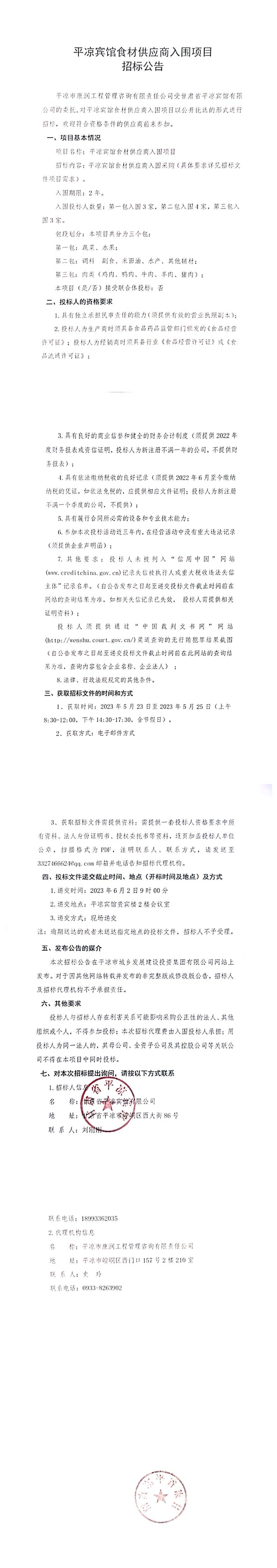 平凉宾馆食材供应商入围项目招标公告